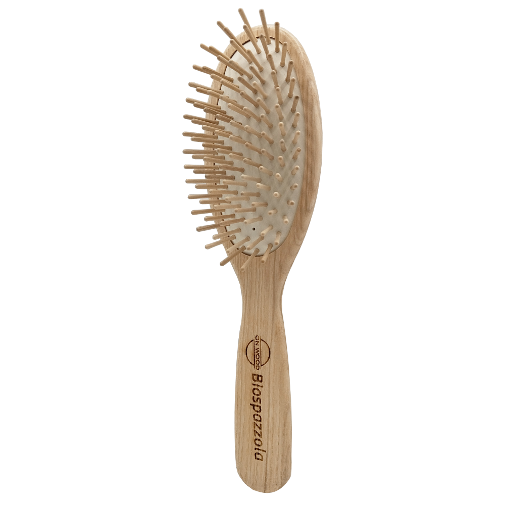 Cepillo de alta calidad fabricado íntegramente con materiales naturales, diseñado para cuidar el cabello y el cuero cabelludo de forma suave, eficaz y sostenible. Su mango está elaborado en preciada madera de fresno tratada con ceras vegetales, y las púas están hechas de resistente madera de carpe. Con una base neumática de caucho natural, que le aporta un movimiento flexible y delicado, creando un efecto masaje que estimula la microcirculación y mejora el aporte de nutrientes y refuerza la raíz del cabello.